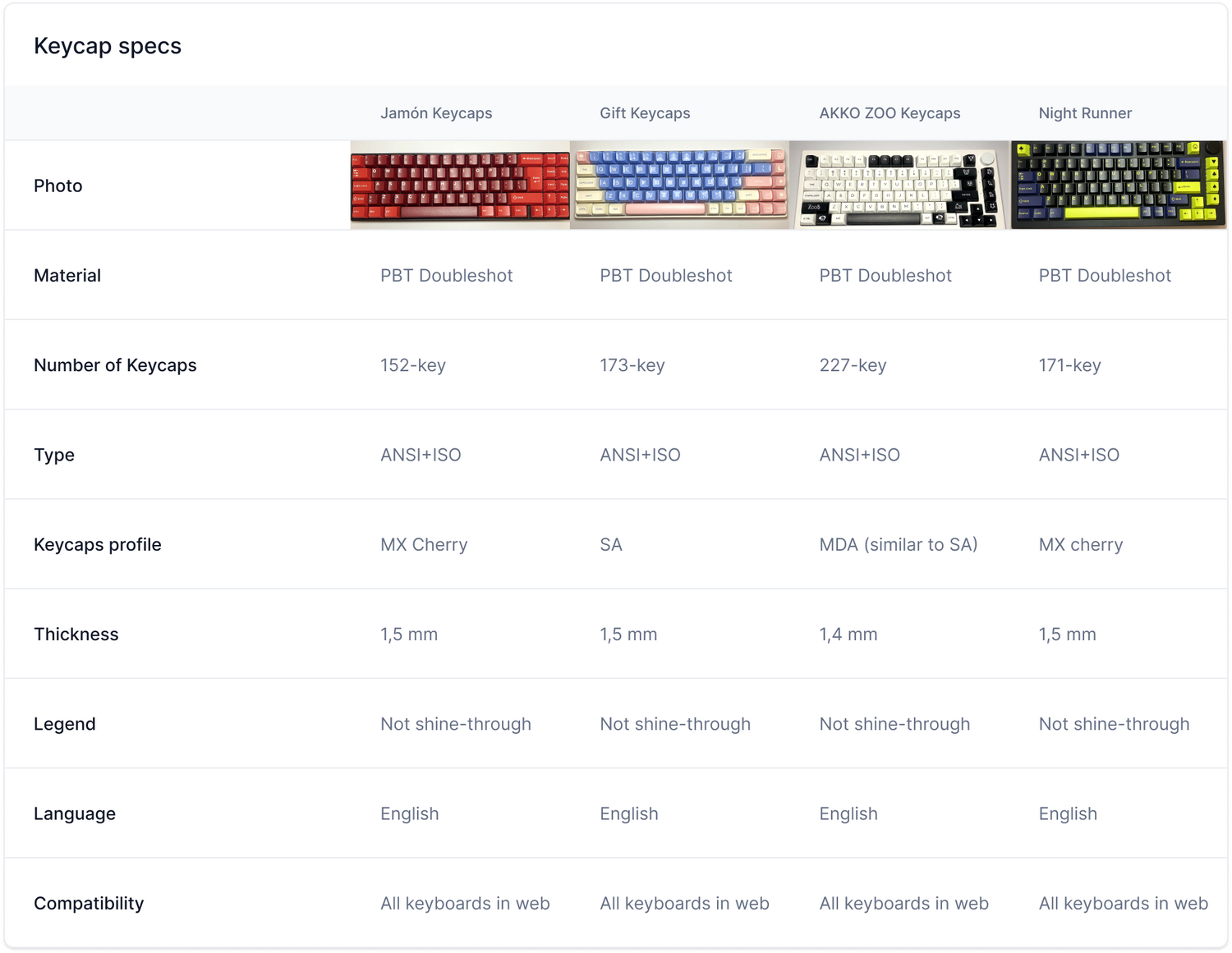 Most of our Keycaps are thought to be compatible with all the keyboard bases we offer.